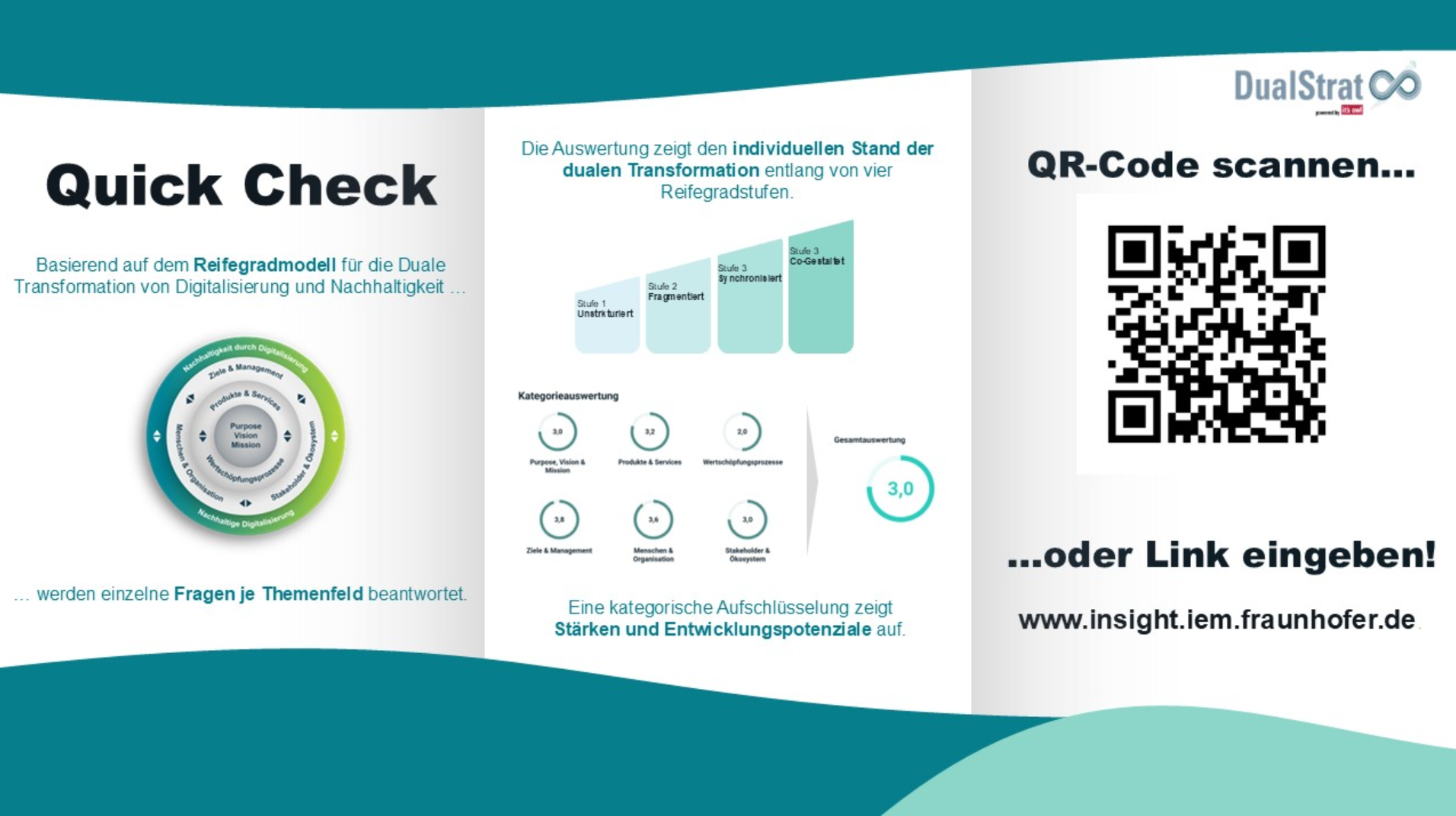 Im Rahmen der dualen Transformation werden Nachhaltigkeit und Digitalisierung gemeinsam und strategisch im Unternehmen vorangetrieben. Es handelt sich hierbei um ein ganzheitliches Umdenken von Prozessen und Strukturen. Mit dem im Projekt DualStrat entwickeltem Quick Check können Sie den individuellen Stand der dualen Transformation Ihres Unternehmens innerhalb von 20 bis 30 Minuten erfahren.